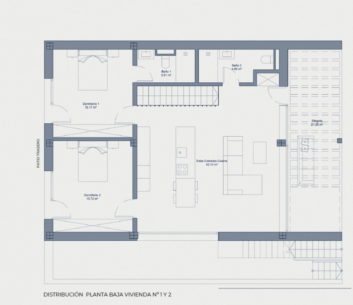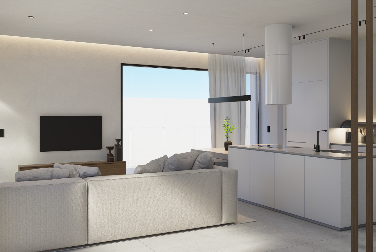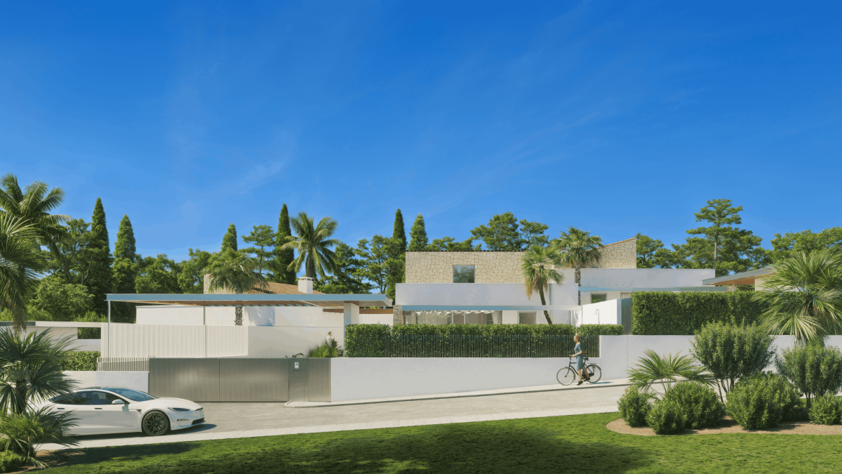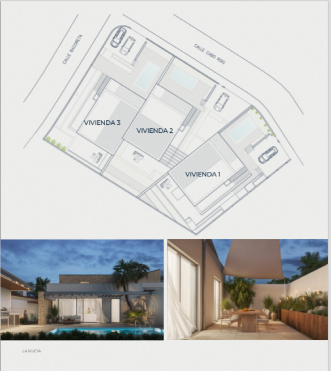 MENTACIÓN Y ESTRUCTURA Las viviendas están diseñadas para ofrecer solidez, seguridad y confort. La cimentación se ejecuta mediante losa continua de hormigón armado y muros de contención impermeabilizados. La estructura de hormigón armado con forjados reticulares garantiza una construcción duradera, estable y con las máximas prestaciones de seguridad. FACHADAS Y AISLAMIENTO Fachada compuesta por bloque cerámico, aislamiento térmico de lana mineral y trasdosado interior de placas de yeso laminado. El acabado exterior será en mortero monocapa de color blanco, proporcionando un aspecto limpio, moderno y duradero. Las amplias ventanas favorecen la iluminación natural y la ventilación cruzada, mejorando la eficiencia energética y el confort interior. CUBIERTAS Y TERRAZAS Cubiertas planas tipo invertida, aisladas e impermeabilizadas, con acabado en grava o baldosa cerámica según la zona. Las viviendas cuentan con terrazas exteriores privadas en planta baja, pavimentadas con gres antideslizante y zonas ajardinadas. No se prevé terraza transitable en cubierta. CARPINTERÍA EXTERIOR E INTERIOR Carpintería exterior con doble acristalamiento tipo Climalit, que garantiza la eficiencia energética y el confort acústico. Persianas integradas en el mismo color que la carpintería. Puerta principal acorazada con cerradura de seguridad multipunto. Puertas interiores lacadas en blanco de diseño moderno. Armarios empotrados totalmente revestidos, con balda maletero y barra de colgar. TABIQUERÍA Y TECHOS Tabiquería interior de yeso laminado con aislamiento térmico y acústico, asegurando privacidad y confort entre estancias. Falsos techos registrables en zonas de instalaciones y yeso liso pintado en el resto de la vivienda, aportando mayor amplitud y elegancia. PAVIMENTOS Y REVESTIMIENTOS Suelos interiores de gres porcelánico de gran formato. Baños revestidos con cerámica de primera calidad y paredes acabadas en pintura plástica lisa blanca. Terrazas y zonas exteriores pavimentadas con gres cerámico antideslizante. COCINA Cocina abierta al salón, con muebles altos y bajos de diseño contemporáneo y gran capacidad de almacenaje. Encimera de cuarzo compacto y fregadero de acero inoxidable bajo encimera. Equipada con electrodomésticos de alta gama —horno, microondas, placa de inducción y campana extractora— marca Bosch o similar. BAÑOS Y SANITARIOS Sanitarios de porcelana vitrificada en color blanco, marca Roca o similar. Grifería monomando de diseño moderno y apertura en frío para mayor eficiencia energética. Platos de ducha extraplanos con mampara de cristal templado. Mueble bajo lavabo con espejo retroiluminado en el baño principal. INSTALACIONES Y CLIMATIZACIÓN Producción de agua caliente sanitaria mediante sistema de alta eficiencia energética por aerotermia. Instalación de climatización por conductos con bomba de calor reversible, con rejillas de impulsión en salón y dormitorios. Fontanería convenientemente aislada, con llaves de corte independientes en cocina y baños. Tomas de agua en jardín y terraza para riego. ELECTRICIDAD Y TELECOMUNICACIONES Instalación eléctrica conforme al Reglamento Electrotécnico de Baja Tensión (REBT). Circuitos independientes para iluminación, fuerza, climatización y electrodomésticos. Tomas de TV, teléfono e internet en salón y dormitorios. Iluminación LED de bajo consumo en toda la vivienda. Videoportero con cámara en acceso principal. EXTERIORES Y PISCINA Cada vivienda dispone de parcela privada completamente vallada, zonas ajardinadas y piscina individual. Pérgola, zonas pavimentadas en gres antideslizante y aparcamiento privado dentro de la parcela.